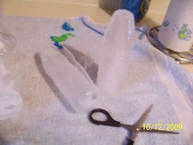 Utilice su cuchillo para cortar el plástico de las botellas. Ahora tienes "Pins". El caucho de globos debe pelar justo al lado.