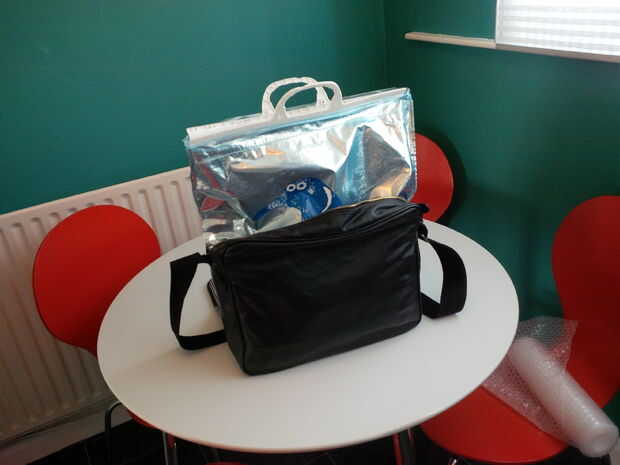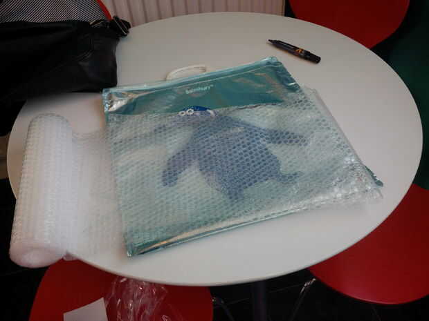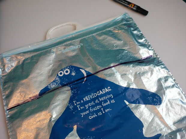 Empuje su estancia bolso fresco en su bolso de hombre asegurándose de que obtiene en las esquinas y tiró rectas y limpias, con una marca de pluma donde la bolsa empuja hacia fuera la parte superior de la bolsa exterior luego quitar. Ponga su estancia fresca bolsa plana y medir una tira de plástico de burbuja que es suficiente para cubrir ambos lados y vuelta por un par de pulgadas cuando envuelto alrededor de la bolsa, cortar 3 de estas tiras todos aproximadamente la misma longitud.