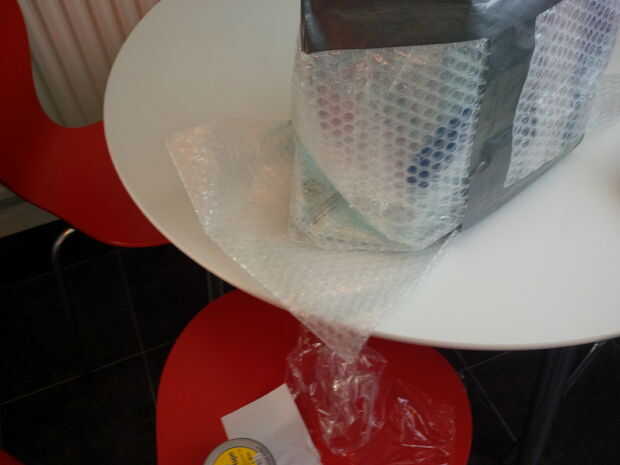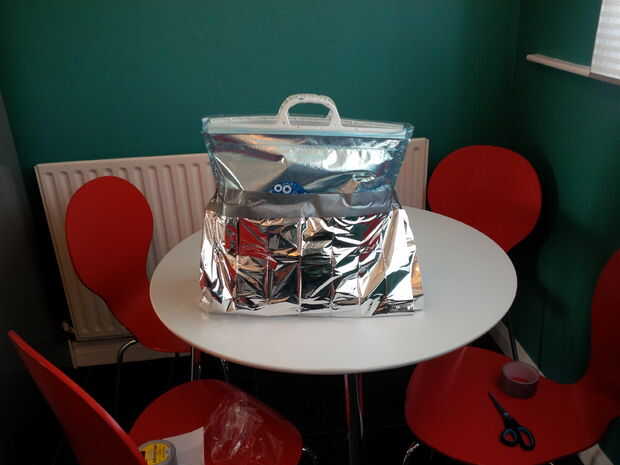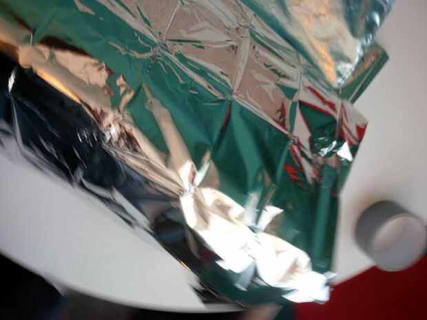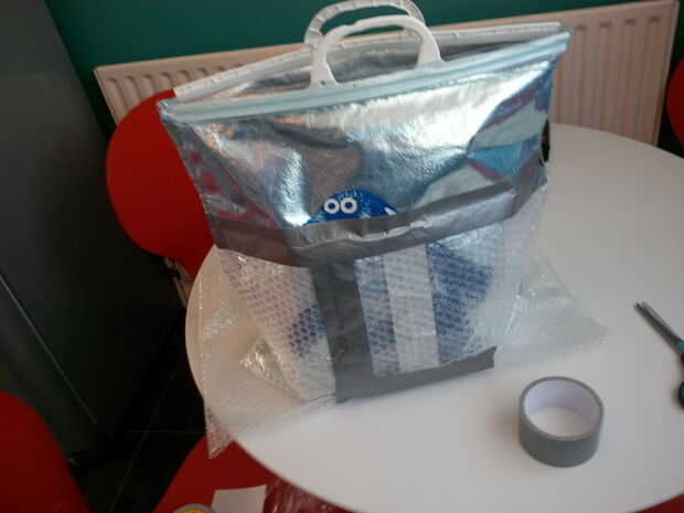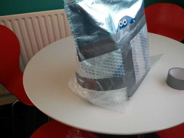 Soporte de la bolsa hacia arriba y empuje el interior hacia fuera por lo que se encuentra en su propia y poner en orden las esquinas un poco como envolver un regalo, luego Envuelva la parte inferior de la bolsa en la manta de la emergencia de la hoja.