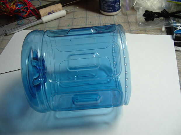 Enjuagar su botella y eliminar la etiqueta. Si friega un poco de mantequilla de maní sobre la goma sobrante de la etiqueta, llegará justo, generalmente. Corta la botella para el tamaño que desee. Había un lugar aseado para perforar los agujeros con una aguja grande de la alfombra, por lo es lo que hice. (Sugerencia-utilice un dedal)