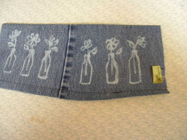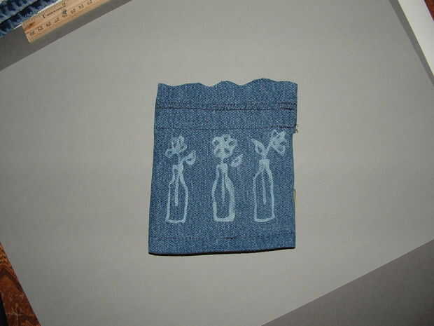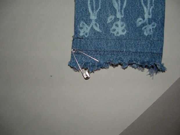 Para la longitud de la tela, mida alrededor de la tapa de la botella más de margen de costura de 3/4 de pulgada para cada lado. Blanqueados un diseño en mi denim sólo por diversión, siguiendo las instrucciones de Goosezilla, pero que no es totalmente necesario. La altura de la bolsa para esta botella de tamaño (33,8 FL OZ) I decir medida a 3 1/2 pulgadas de tela más margen para la parte inferior y dejando por lo menos una extra pulgadas y media para el canal en la parte superior de la costura. (Nota: Si utilizas un dril de algodón más ligero, no sé si me gustaría probar y pin lo debilite o no. Hemming podría ser una opción mejor. Sin embargo, deberás ajustar la altura de su tela para compensar.)