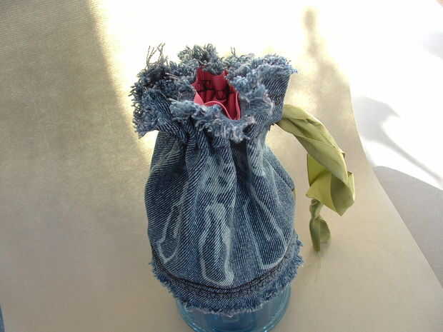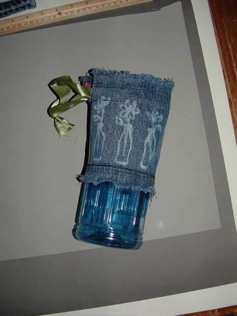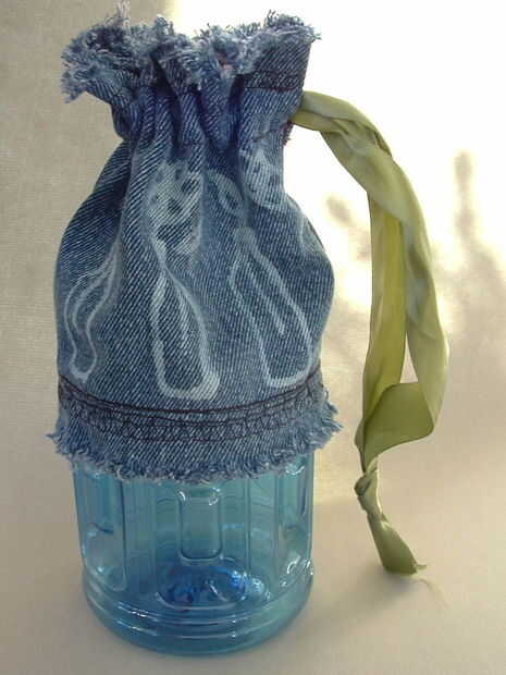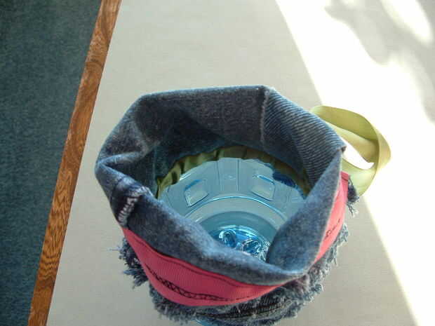Para que tengas tu botella, tiene su tela todo listo, ahora es tiempo de poner juntos. Cosí mi tela se ajuste alrededor de la parte superior de la botella. Puse un pequeño trozo de cinta en la costura para hacer una "etiqueta".