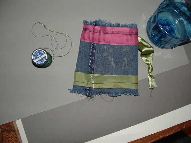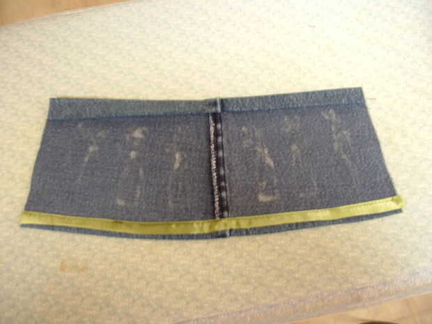 Para la parte inferior, medir la cinta igual que en la parte superior. Cosí la cinta verde del lado derecho hacia abajo, para que cuando volcó, lo bastante verde mostraría (ver cuadro 3). También coser una puntada de zig-zag tipo para la parte inferior también, como resultó pin-raído también.
