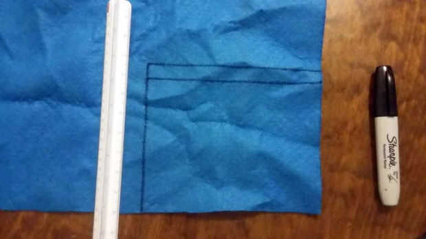 Realizar con ayuda de una regla y un marcador o pluma un rectángulo de 13cm por 18cm, esto para hacer la base de la bolsita. Aparte realizar el trazo de un rectángulo de 18 cm por 1,5 cm