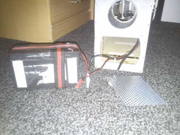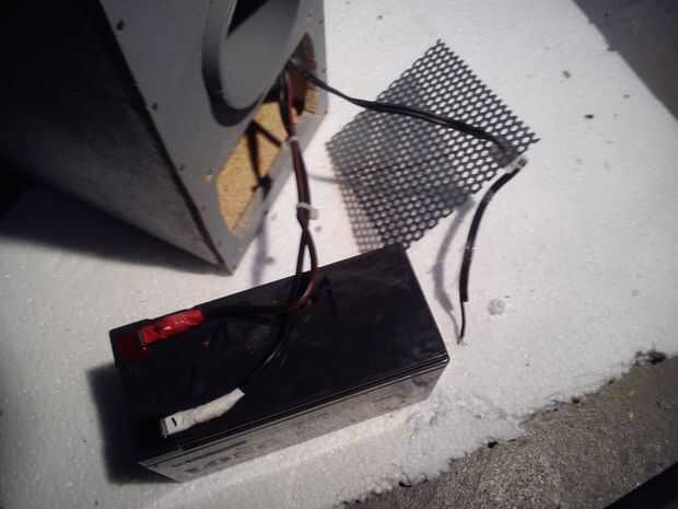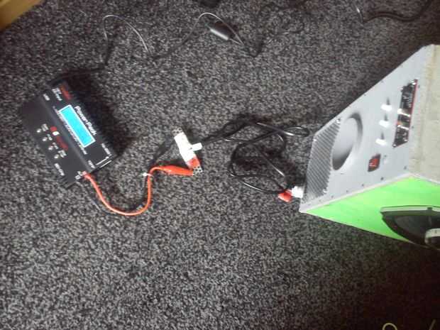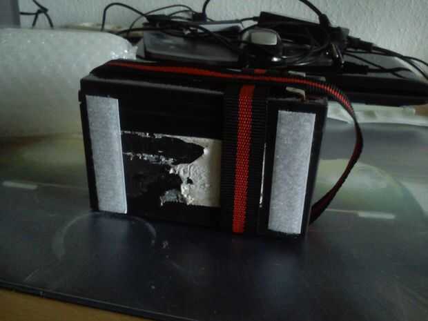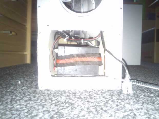 Una batería de plomo gel 12V alimenta el dispositivo. Con velcro y restos de los trincajes la batería es sostenido en lugar pero siendo fáciles de quitar. Ahora el ghettoblaster estaba listo para usar. Con un cable de carga de selfmade soy capaz de cargar la batería mediante el puerto de carga sin sacarlo.