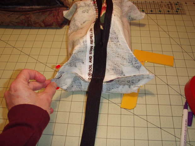 Esto es un poco difícil de explicar, pero ojala la foto demostrará las costuras costura ahora. Sostiene la bolsa con la cremallera hacia arriba, (como una caja de Kleenex) marca y perno de 1"- 2" en las esquinas. Estas costuras paralelas a la cremallera y dan la bolsa a su altura. Si la bolsa sale demasiado corto, aumentar la longitud de las costuras como coser en cerca de la cremallera.