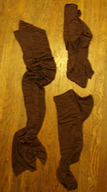 1. Tome la yarda de jersey de punto y corte el largo camino para tener dos tiras largas de tela. Utilizar un criterio si te gusta la precisión. Una de ellas corta a la mitad en 2 partes iguales de corto y dejar la otra (aún de largo pieza) a un lado por el momento (Foto #1).