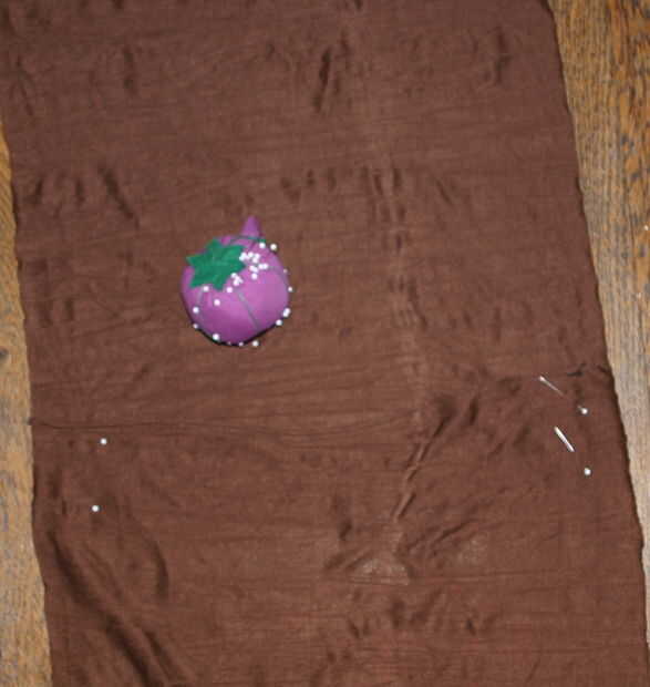 3. Tome sus dos mitades corto y Sobreponga los bordes dobladillados unas pocas pulgadas. Los pines en su lugar (Foto #3). Coser o Hilvanar los superposición los bordes laterales juntos (no coser cierre la parte que sólo tuvo todo aquel momento a dobladillar). Ahora debe tener una tira de tela con un agujero grande en el centro donde se unen las 2 piezas.