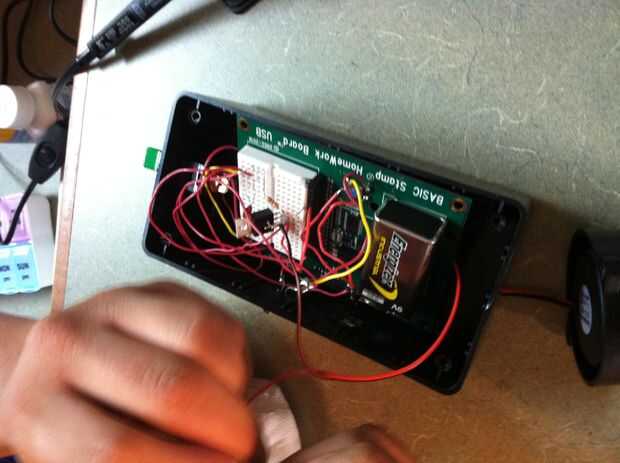 6. ahora que has creado tu propia alarma bolso! Puede utilizar su caja si lo desea. Sólo tiene que colocar su placa en el interior, ejecutar el interruptor, su altavoz y el foto resistor hacia el exterior del recinto, como lo hicimos. (nos los orificios perforados para éstos).