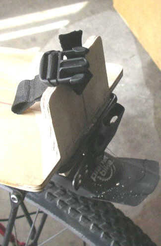 Taladré un agujero de 3/16" a 1/2" de la parte superior de la espalda de la estancia posterior vertical. Luego colocar la correa sobre la parte superior de la estancia posterior bien y utiliza un punzón afilado para empujar a través de ambos lados de la correa. Ahora funciona un tornillo largo 3/16" 3/4 de pulgada a través de la correa, a través de la cinta y luego a través de la cinta en el otro lado. Arandelas y una tuerca para sostienen la correa seguro. Usé el mismo sistema para montar la otra parte de la hebilla a la pieza de metal en mi estante de la bici.