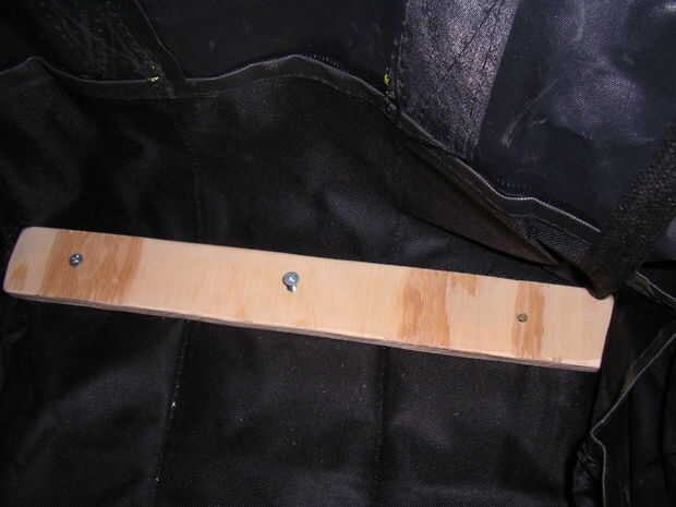 Pinté la base una sombra agradable de negro para que coincida con mi bolsa. También puse dos capas de barniz para proteger la base de la lluvia. Entonces usé 6 tornillos para madera para unir 2 tiras de madera colocado dentro de la bolsa para amarrarla a la base.