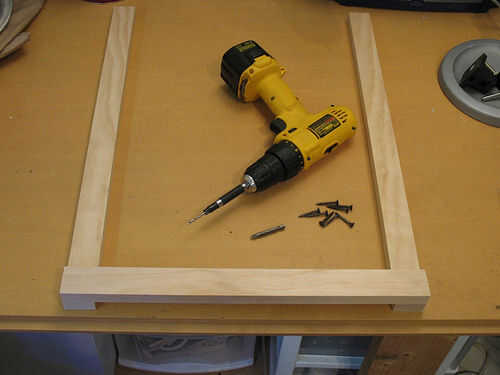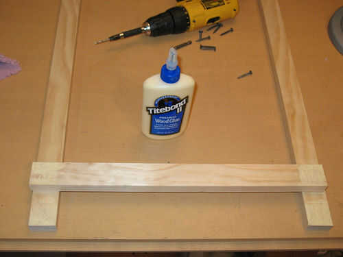 Colocar 2 de las piernas (24" largo madera) y uno de los lados largos (17,5" largo madera) como se ve en la foto principal. Necesidades pegamento para madera en conectar las piezas que tocan, así voltear la pieza lateral para aplicar el pegamento de madera en sus extremos y voltearla sobre.
