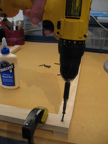 Después de pegado, usted necesitará reforzar estas conexiones con tornillos. En esta foto principal, me han afianzado con abrazadera mi madera juntos y estoy midiendo mi broca avellanado el agujero piloto. No quiero que la broca para recorrer todo el camino, sólo alrededor de una pulgada y un cuarto, para que coincida con la longitud de mis tornillos. Después de medir, perfore el orificio piloto. Si no tienes las mechas de Inclinador d bolos como yo, utilice una broca avellanador llano o solo utilice una broca grande para hacer la divet para la cabeza del tornillo a ras.