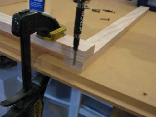 Luego, repita el proceso - orificio piloto taladrar y atornillar - en el otro lado del mismo palillo de madera. Ahora debe tener un marco en forma de U, abierto en un extremo. No coloque el otro trozo de madera todavía, lea el siguiente paso en primer lugar, antes de completar el marco rectangular! (Gracias a jwm.herbert por este comentario clarificador).