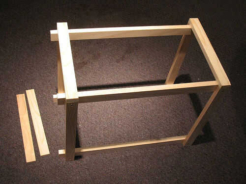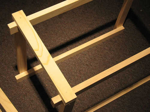 Establecer sus marcos planas 2 en su borde, con las piezas de la pierna, uno frente al otro. Usted querrá conseguir alrededor 14" aparte, así que usted puede poner los lados de 14" en la parte superior. Unte el pegamento en las piezas que tocan, piloto perforar así van en las piernas, no los extremos de la otra parte. Poner sus tornillos en cada momento.