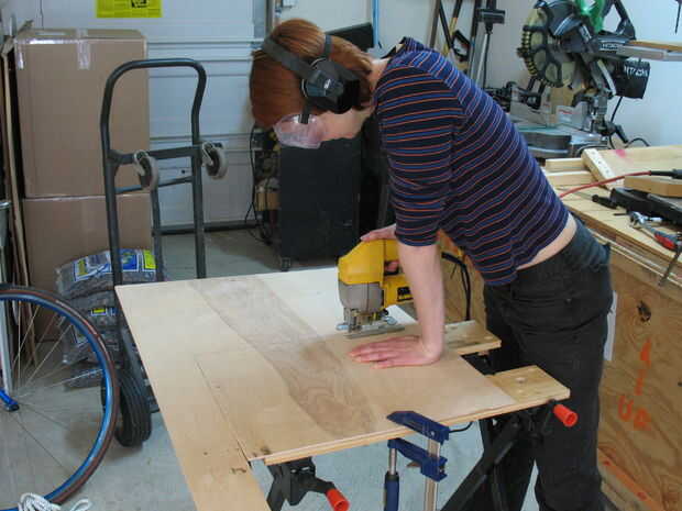 Obtener una sierra de calar con una hoja de madera instalada en él, ponerse sus gafas de seguridad y protección para los oídos y hacer los cortes. Tenga cuidado de no cortar su tabla o sierra caballo. O los dedos.