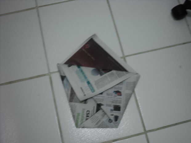 desarrollé este cubo para reciclar periódicos. Puede que no sea muy impresionante, pero es fácil y puede hacerse rápidamente. He utilizado para residuos vegetales, es absorbente y puede ser compostado. Es muy fuerte si con dos o más documentos. Desar