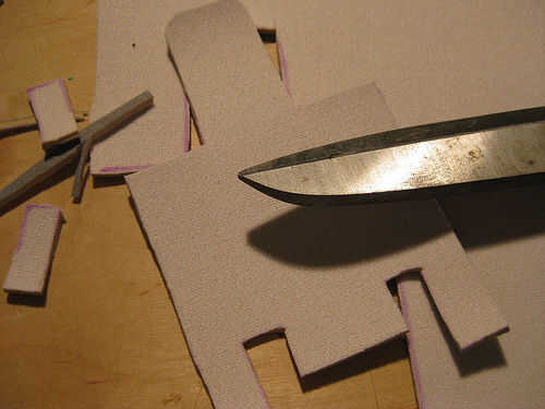 Corte pedazos de tejido conductivo y fusible para que coincida con las piezas que se muestra en la galería de símbolos. Para hacerlo más fácil para usted puede primero un trozo de entretela fusible a un pedazo de tejido conductivo del fusible y luego rastrear las piezas y recorto.