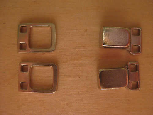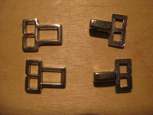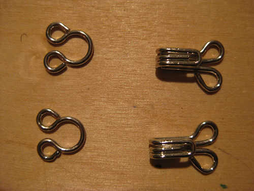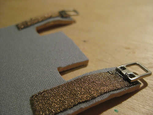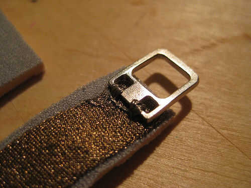 Un hilo conductor y lo doble si quieres. Coser los lazos a los parches de tejido conductivo (ilustración plantilla cf2, cf3). Asegúrese de que usted consigue 3-5 puntos por el agujero de cada lazo. Asegúrese de que usted no sólo aunque el parche de tela conductora pero también a través del neopreno, puesto que se trata de que todo el peso de las baterías tira y debería ser una conexión muy resistente.