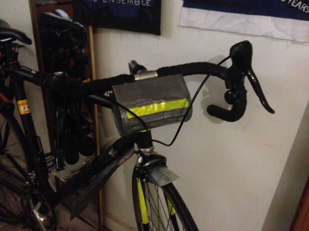 Esto es un arte intermedio y útil para hacer con cinta adhesiva y te hará sonreír una vez que termine. Pero antes de hacerlo, usted puede practicar más con cinta adhesiva. La bolsa va alrededor de las manijas de la bici, así que usted puede almacenar