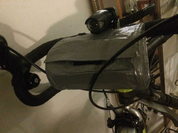 Como ya he dicho que los ladrones de la bicicleta podrían simplemente tomar todo para objetos de valor; Esta bolsa de bici cinta de conducto será probablemente el objetivo en algún momento. Podría ser un poco más segura con amarra, pero son fáciles de cortar. Estoy pensando correa metálica.