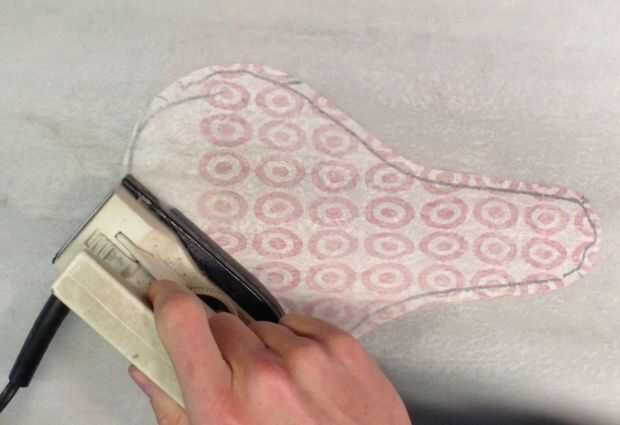 1. tomar la hoja cuadrada y traza su asiento sobre ella en el medio. Ser generoso con tu línea, es mejor tener más material que no es suficiente. 2. Recorte la forma, dejando un 1/4 adicional "fuera de la línea de costura. 3. plancha la forma del asiento una vez más para sellar los bordes.