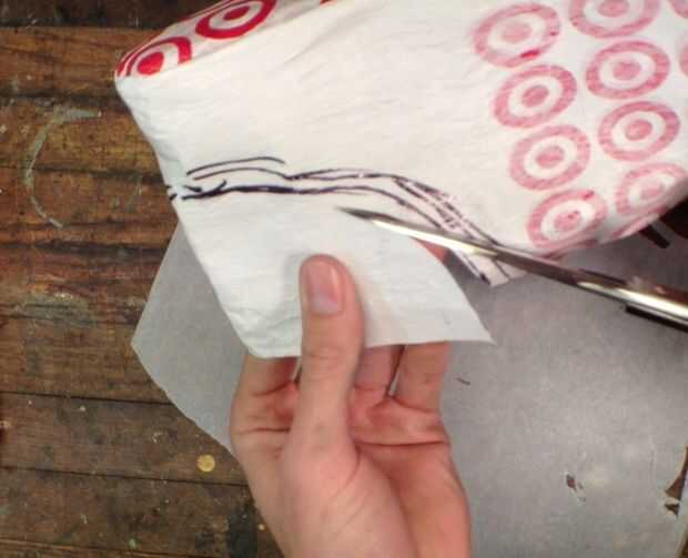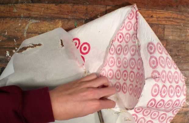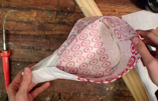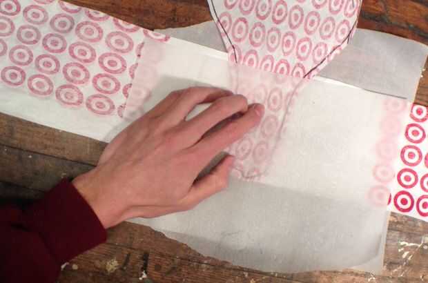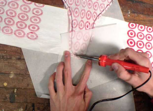1. Alinee el frente de la silla en forma de hoja con el centro de la hoja de perrito caliente. Usando el soldador, virar los dos bordes juntos, una vez más trabajando entre hojas de papel de pergamino. Este será el punto de partida.
