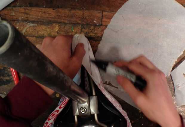4. con los dedos, cierre las hojas en la parte delantera de la bici del asiento y trace una línea áspera. A sellar esta costura entre la parte delantera del asiento y el poste.