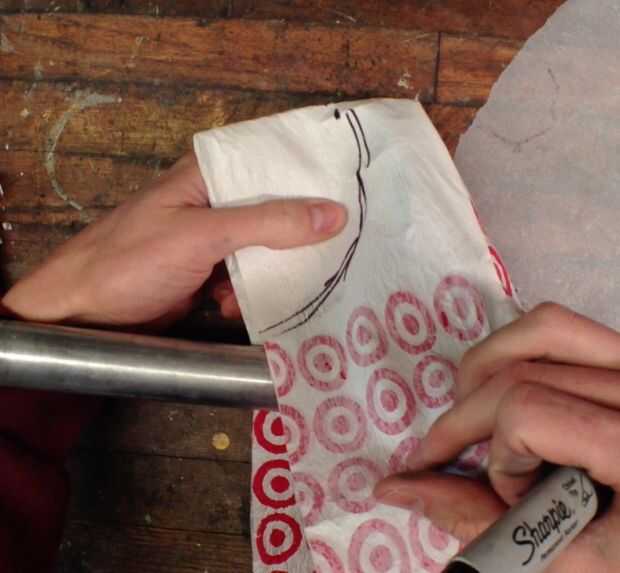 2. trabaje lentamente en una dirección, tal vez 1/2" a la vez, manteniendo el borde de la forma del asiento con el borde de la hoja de perrito caliente.