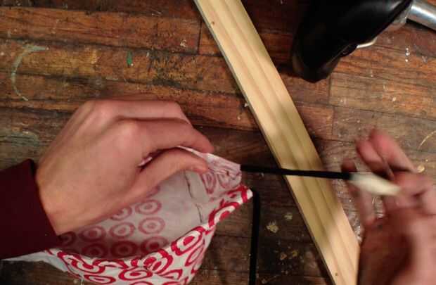 1. doble la parte superior de la hoja de perrito caliente aproximadamente 1/2" y hacer una costura, dejando un tubo para el lazo. 2. amarre un cordón a un alfiler y colócala en el tubo.