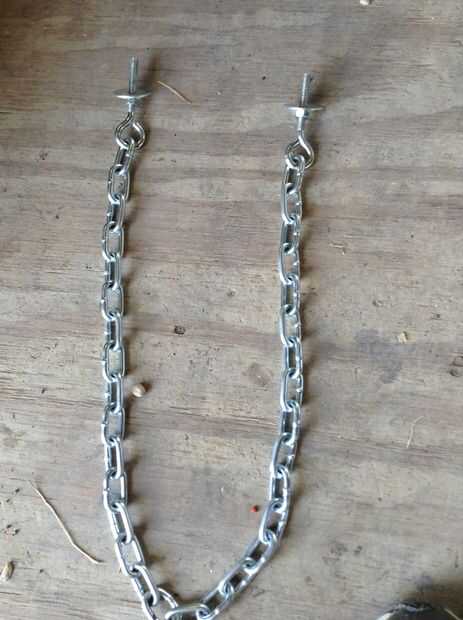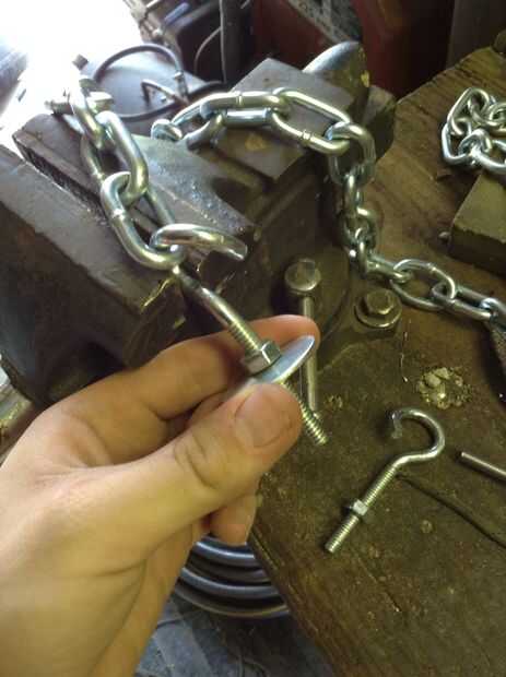 Poner la cadena en uno de los "ojos" y cerrar el ojo del perno alrededor de la cadena. A continuación Asegúrese de que su cadena es recta y no es trenzado y cerca de ojo de otro perno en el otro extremo de la cadena. Ahora repita este paso en la su otra cadena y usted debe tener 2 de las secciones de cadena he foto de arriba.