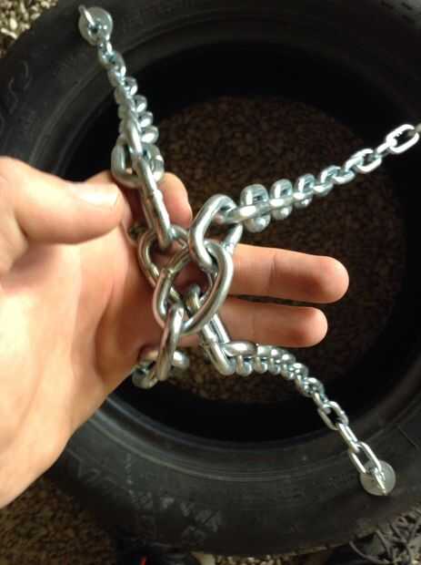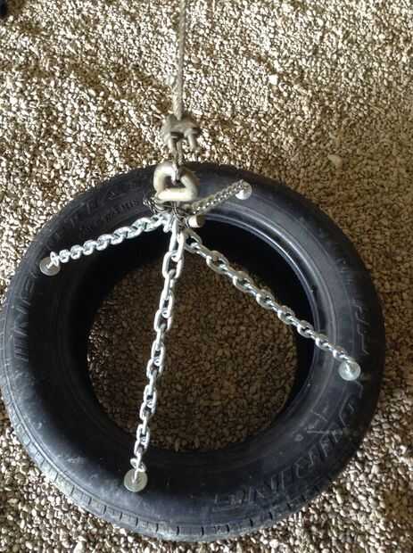 Poner sus pernos de ojo en los agujeros y ponen su otras arandelas y tuercas y apriete firmemente para peso del neumático los no retroceda. Asegúrese de hacer una X con las cadenas y encontrar el enlace medio en ambas cadenas y marcarlos. Ahora ir y ponerlos, cruzado de uno a otro, en el gancho "S" y envolver el alambre alrededor de él así que no puede saltar fuera del gancho. Manera usted tiene que utilizar una llave y un martillo para hacer los enlaces más grande para encajar el gancho de "S". Medir, cortar y colocar su aislamiento de la pipa a las cadenas. Quiero colgar mi saco de una moza así puedo ajustar su altura a lo que quiero.