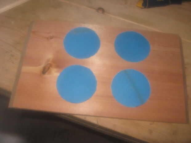 Coloqué el extremo abierto de la copa sobre un cartón azul y trazó un círculo. Luego colocar el fondo de la taza dentro de ese círculo (centrado por ojo) y trazó otro círculo. Elegí un punto entre esos dos círculos y que sería el diámetro del agujero. Usé un compás para dibujar el hoyo final y luego cortar cuatro círculos. Aquí estoy colocándolos para mejor ajuste.