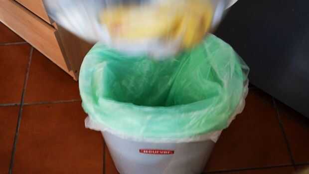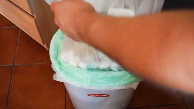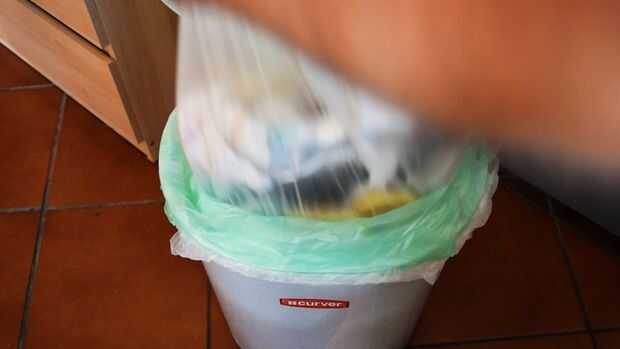 Apuntalar una bolsa de plástico de la hoja mientras se llenan de hojas es mucho tiempo.  Y la succión creada por la eliminación de las bolsas desde el bote de basura tiende rasgar la parte superior de la bolsa.  Simplemente retire la parte inferior d