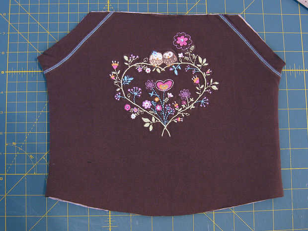 2) corte recto en la parte superior de la camisa justo por debajo del escote delantero. Cortar lo más cerca del cuello como sea posible, especialmente si el diseño de la camisa se coloca alto, como el mío es. Una almohadilla de corte y la regla pueden ayudar a hacer un corte recto.
