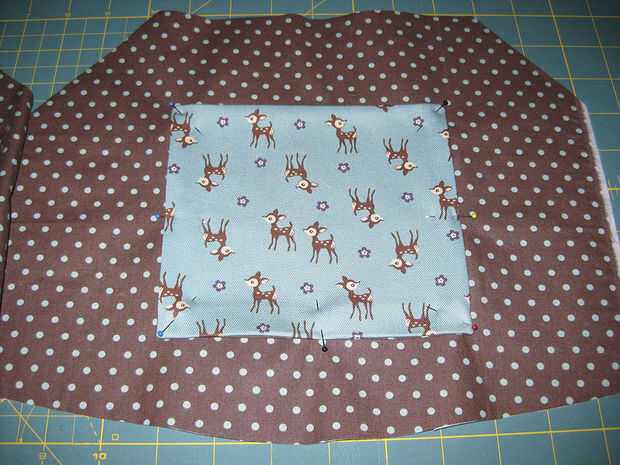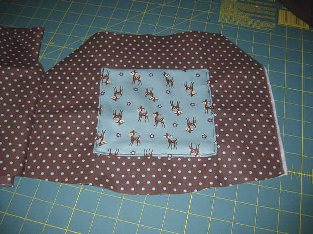 4) el bolsillo en lugar del perno en la parte frontal de la parte de unión del revestimiento. Asegúrese de que es el borde plegado del bolsillo en la parte inferior. Coser el bolsillo a la mucosa a lo largo de los lados y la parte inferior. Su guarnición deberá verse ahora como la quinta foto.
