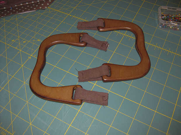 4) pon una tira cada manija abrir y plegar con las costuras en el interior. Alinee los bordes y ejecutar unas puntadas a través de los fondos para mantener en su lugar.