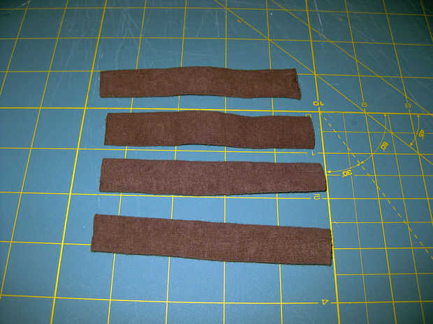 3) recortar el exceso de la costura, luego gire cuidadosamente la tira de adentro hacia afuera. Trate de centro de la costura a la mitad de las tiras y luego las tiras planas con los dedos. Cortar las tiras por la mitad transversalmente, por lo que tiene un total de cuatro tiras de 4 pulgadas. Estos deben ser lo suficientemente justo ancho para caber a través de las aberturas en las manijas.