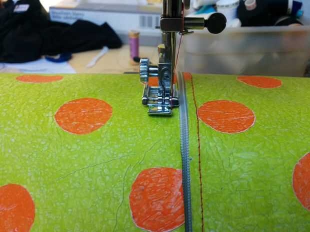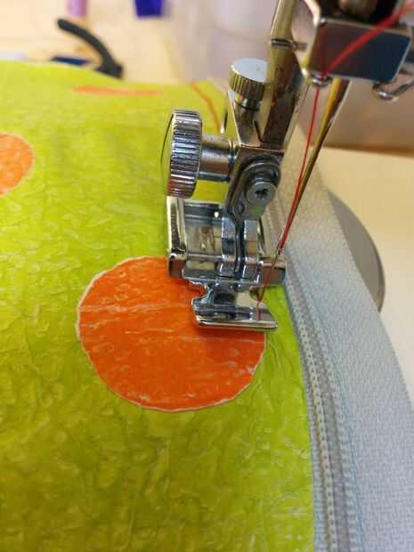 El pie en la máquina de coser en el pie de cremallera y luego coser a lo largo de la cremallera en uno de las piezas y luego el otro al lado de la cremallera