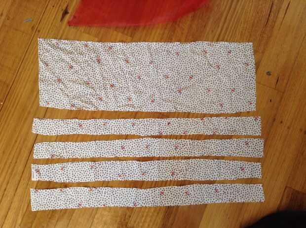 Cortar una tira de la parte superior de la bolsa y dos tiras para las correas (cortar cuatro tiras para las correas pero dos cosidos juntos).