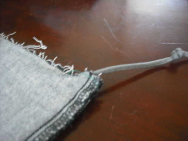 Ahora que donde en pista esto es lo que hacer a continuación. Tome ambos extremos de la cuerda poner por la parte superior y a través de las esquinas inferiores. Al hacerlo un nudo doble en la parte inferior de la cuerda no sale después de coser de nuevo. Asegúrese de que puede obtener cada lado tan iguales como sea posible antes de continuar.