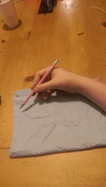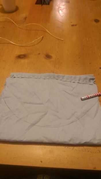 Primero doble su tela por la mitad a donde los bordes del pliegue en la parte superior y toman un lápiz y dibujar su parte inferior ideal para tu bolsa de cinch y comienzan a cortar las marcas han hecho mantener la tela doblada. ¿Derecho de paso fácil? ¿Siento que es demasiado corto pero eres probablemente feliz con esta, la derecha? Por supuesto estás! PASAR!!!!!!