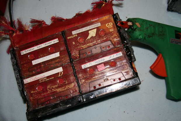 cubrir las lagunas con glewgun negro, estabiliza toda la bolsa. decorar con cosas que encuentras