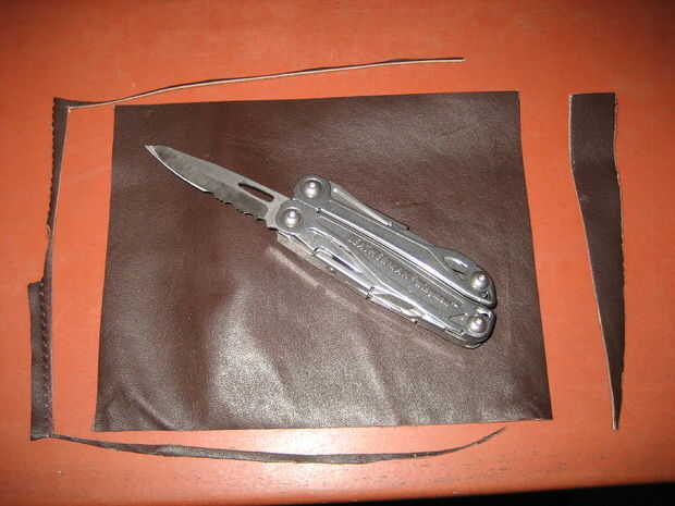 Corte un rectángulo de cuero. Mina fue bastante al azar, sólo parecía que podría caber mi cámara.