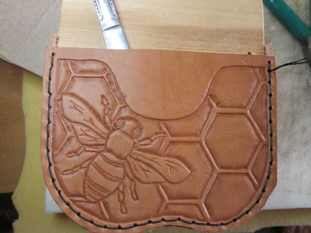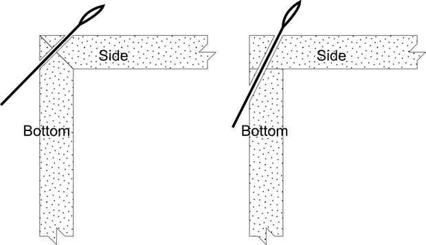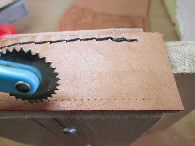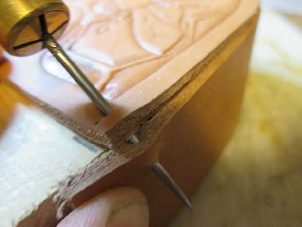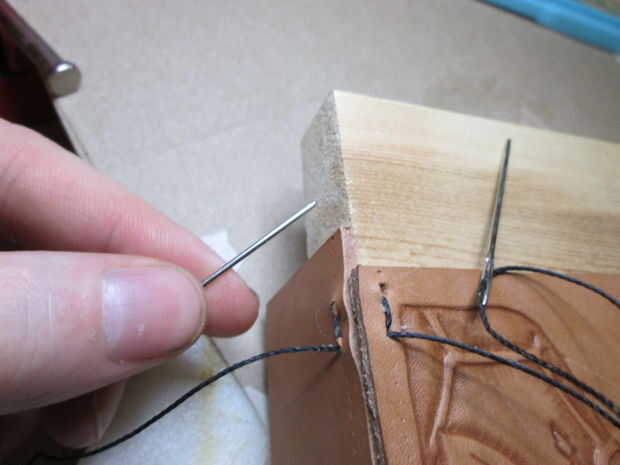 Esto de coser sin una plantilla de madera para sostener las piezas en su lugar sería casi imposible. Lo sé, porque he intentado varias veces hacerlo. Hacer un agujero con el punzón y llevar una aguja a través de. Hacer otro agujero y pasar cada aguja a través del lado opuesto. Nota: en la sección Cómo el agujero nunca debe estar visible desde el interior. Por supuesto, es en un mundo perfecto. En realidad, hacer las puntadas tan aseado como usted puede manejar.