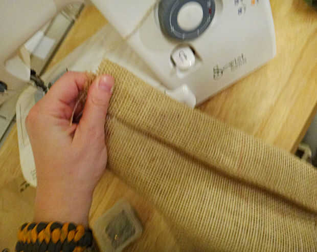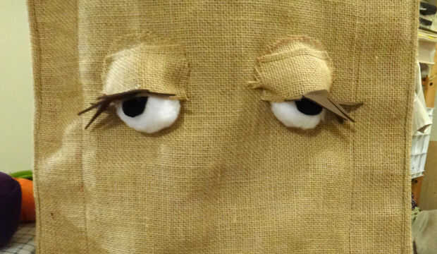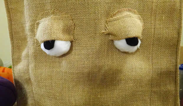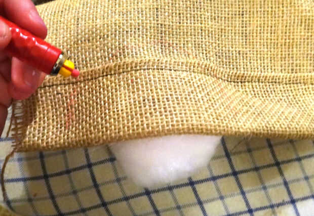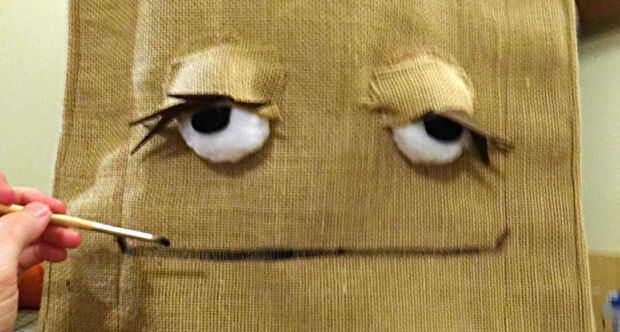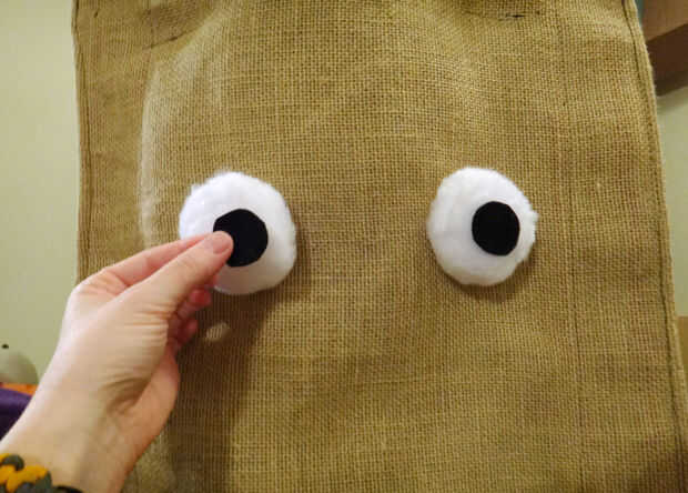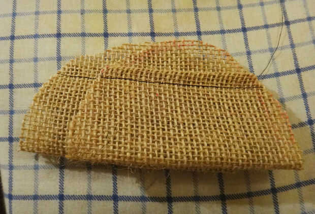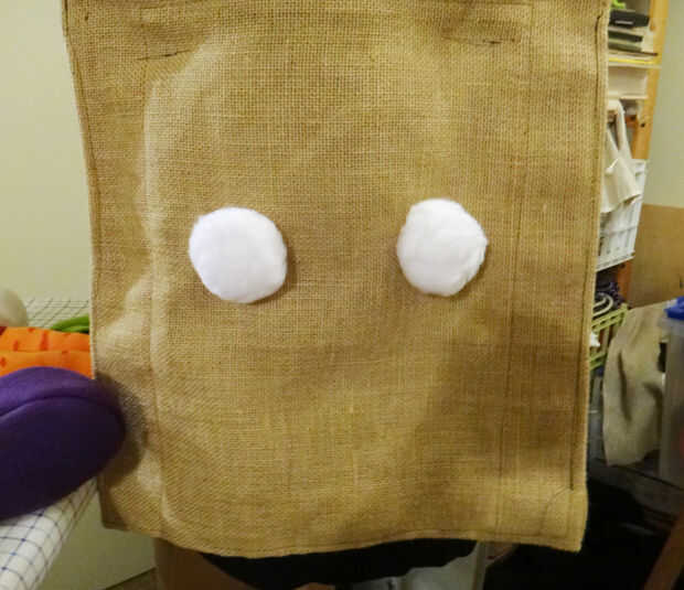 Corte 2 medias lunas de arpillera para caber sobre los ojos de puff blanco.