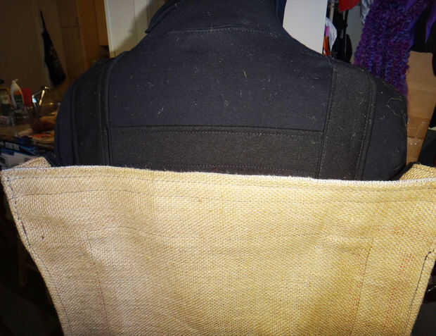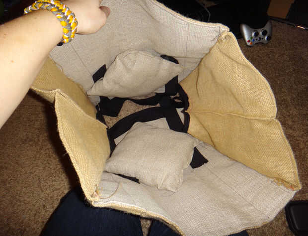 este bolso está hecho con el saco bastante nuestro alpiste vino en.  El bolso terminado es aproximadamente 15" alto, 14" ancho y 9 pulgadas de profundo.Se hace conuna bolsa de plástico de alpistehilo y máquina de coserbateo de edredón (poliéster