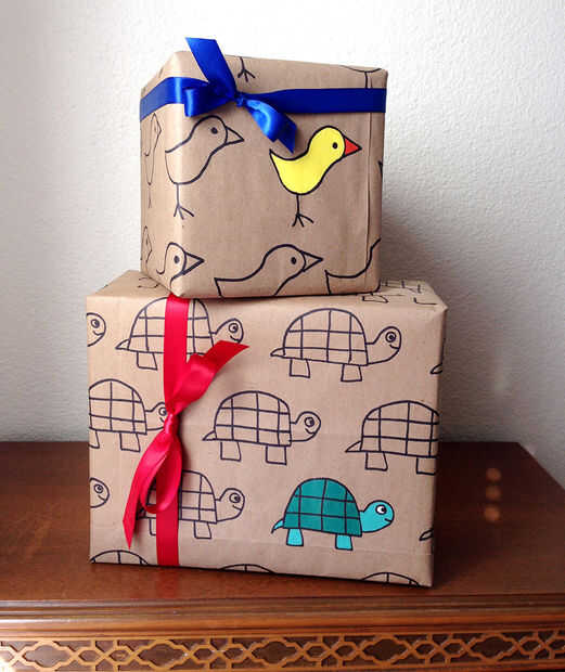 En este Instructable que decoran el papel de regalo con diseños de animales utilizando un rotulador fieltro lápiz y pintura acrílica, pero puedes decorar tu papel de regalo con sellos, adhesivos, lápices de colores, Espirógrafos, brillo... get creative!