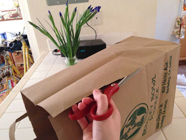 Comenzar a cortar la bolsa en una de las uniones de las esquinas. Reducir la longitud de la bolsa hasta llegar a la parte inferior. Luego corte en la parte inferior de la bolsa hasta recortar el rectángulo inferior. Te queda un rectángulo largo.