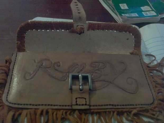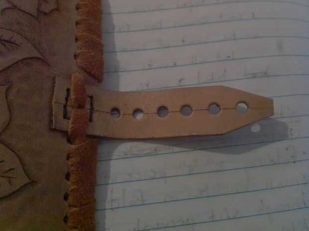 que tomé el pedazo de 2x3\4in de cuero y doblar por la mitad haciendo que los extremos aun, en extremo abierto usando el punzón hice un cuadrado de agujeros uniformemente espaciados costuras de garganta entre los agujeros con el punzón que en extremo doblado, hizo una pequeña ranura en el centro de que me hacia abrir piel y cortar la línea de ~1\2in y ensanchado a mi gusto usando el cuchillo multiusos. con la última pieza de cuero 3x3\4in surco una línea a lo largo de centro, que coloque un extremo en el borde superior de la pieza de 7x5in de cuero en el centro, que hice los agujeros para costura y acanalado entre todos los orificios hechos con punzón. jajaja que en la misma pieza perforar agujeros uniformemente espaciados siguiendo el surco de punzón (punch hueco 5\32) un agujero a través de dos piezas de cuero en el centro de la costura cuadrada, ahora con el punzón en la pieza de 7x5in de cuero en el extremo opuesto de puntadas hacer un ligero surco 1\4in del borde de la tapa orificio a orificio de la puntada la puntada de golpe los agujeros uniformemente espacio siguiendo el surco que acaba de hacer con el punzón hueco 1\8 pulgadas.